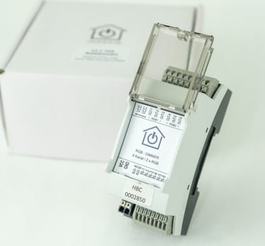 Die sechs 24-V-PWM-Kanäle des Haus-Bus RGB-Dimmers lassen sich äußerst flexibel nutzen. Sie können wahlweise als zwei RGB-Einheiten, als RGBW oder sogar als RGBWW-Dimmer mit zusätzlichen Einzelkanälen konfiguriert werden. Ebenso ist es möglich, die Ausgänge einzeln zu verwenden, um 24-V-LED-Spots präzise zu dimmen.