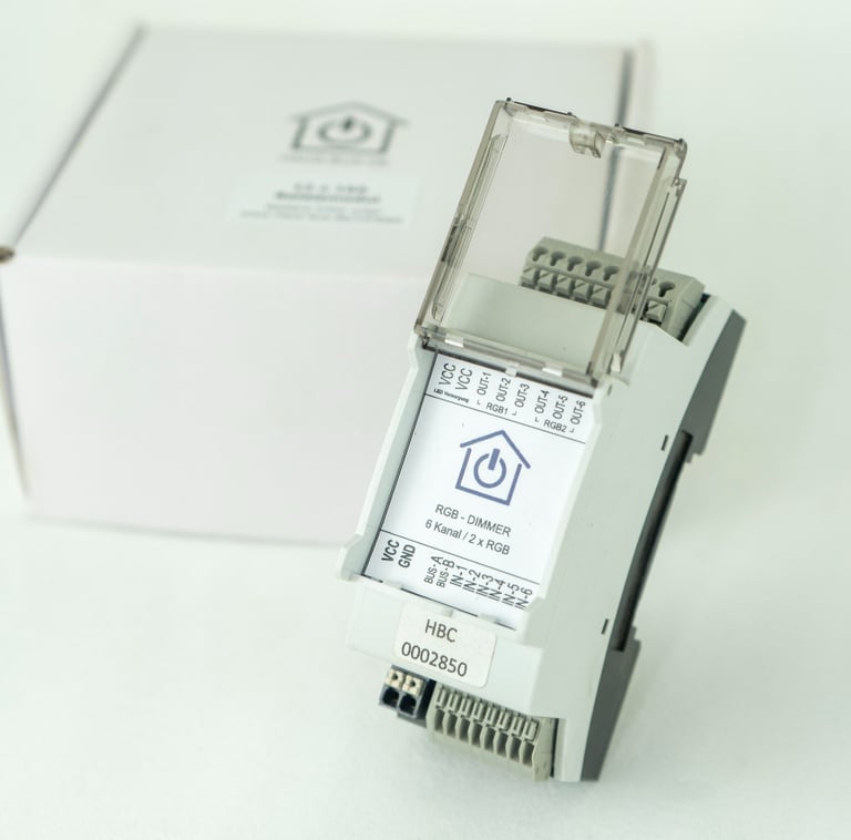 Das Modul stellt dafür sowohl sechs unabhängige Einzeldimmer bereit als auch zwei RGB-Steuerbereiche (für die Kanäle 1–3 sowie 4–6). So kann entweder jede Farbe separat geregelt oder direkt eine komplette RGB-Farbe eingestellt werden.